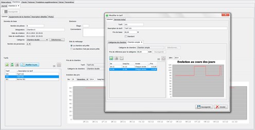 L’évolution des prix pour chacun des tarifs sur une année peut être visualisée à tout moment dans un graphique. Le statut de réservation y est également consigné, facilement repérable grâce à différentes couleurs. Ainsi il est possible d’un seul coup d’œil de savoir si le client a pris possession de sa chambre ou non.