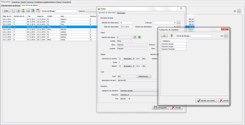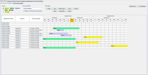 Grâce au logiciel vous pouvez afficher toutes les réservations à l’aide d’un graphique ou bien dans un tableau. Vous pouvez également ajouter à chaque chambre un certain nombre d’attributs tels que la surface, la présence d’un minibar, d’une climatisation, la disposition de la chambre etc… Toutes les données peuvent être modifiées ou bien supprimées à tout moment. Le programme répartit les chambres par catégories, que vous pouvez vous-même définir. Bien entendu, il contient aussi plusieurs catégories prédéfinies disponibles après l’installation. Une autre fonction également incluse dans le programme vous permet de surveiller le statut de nettoyage de la chambre, modifié automatiquement lors d’un check-out.