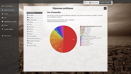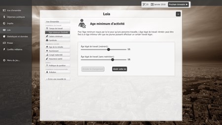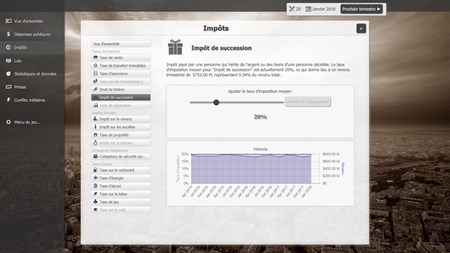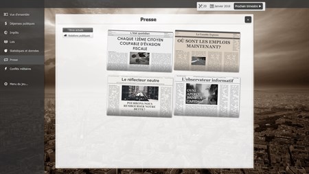 Il y a des objectifs à atteindre, comme la réduction du taux de criminalité ou l'atteinte d'une certaine cote de santé publique ou d'éducation. Mais à part ça, il est déjà intéressant de biduiller les différentes options: que se passe-t-il si l'on baisse le salaire minimum? Et si vous changez la durée du congé de maternité? Ou l'âge de la retraite? Vous pouvez également faire des changements plus sérieux, par ex. introduire de lois sur la censure, le service militaire obligatoire, l’interdiction d'espèces ou le revenu de base universel. Il y a des options militaires, donc vous pouvez lancer une guerre contre un autre pays dans le monde, et ajuster le mode opératoire pendant que le conflit est actif. Mais assurez-vous de ne pas le laisser déraper car, par example, certains pays ont également une option nucléaire. Le jeu comprend aussi un système de relations publiques et médiatiques, où vous pouvez lire les titres les plus intéressants, et essayer d'influencer les médias avec des campagnes de relations publiques, des interviews, et similaires.