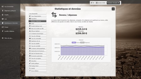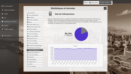 Le jeu simule un pays entier: population, endettement, PIB, croissance économique, chômage, criminalité, espérance de vie, taux de natalité, taux de mortalité, état de l'infrastructure, etc. Le joueur peut ajuster les budgets, les taxes, les lois, et voir quel est le résultat.