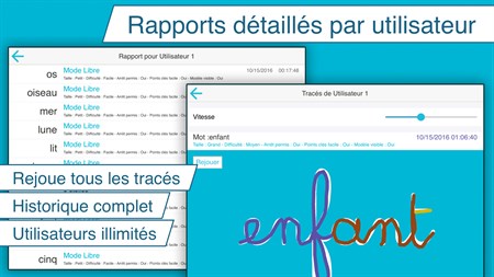 • Les rapports détaillés permettent de savoir exactement ce que chaque enfant a fait (possibilité de revoir l'enregistrement dynamique du tracé de chaque lettre ou mot) • Possibilité de créer vos propres listes de mots ou de lettres. • Un vaste éventail de réglages, parmi lesquels on peut citer la taille des lettres, le niveau de difficulté, la possibilité de montrer ou de masquer le modèle, permet d'adapter le niveau des exercices à chaque enfant. • Pour chaque lettre, le nom et le son de la lettre sont prononcés • Majuscules, minuscules et chiffres • Un mode progressif "5 étoiles", entièrement personnalisable • Possibilité de créer différents utilisateurs • Mode gaucher