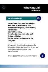 Interactive features within the app include pronunciation of Māori words, maps with Māori names and iwi groups, mihimihi/pepeha (introductions), ngā mihi (greetings), poroporoaki (farewells), whakataukī (proverbs), and waiata (songs).