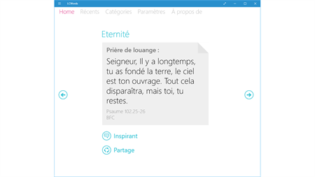 CARACTERISTIQUES CLES : * Profitez d’une interface simple et facile à utiliser. * Lisez chaque jour un verset soigneusement sélectionné à partir de notre grande base de données de versets bibliques. * Enregistrez les versets dans vos Favoris. * Partagez directement les versets avec vos amis sur Facebook, Twitter, par texto ou par courriel. * Utilisez l’application et lisez les versets dans 12 langues : Allemand, Anglais, Chinois simplifié, Espagnol, Français, Indonésien, Italien, Néerlandais, Polonais, Portugais brésilien, Russe, Ukrainien.