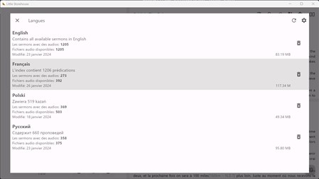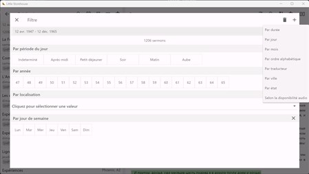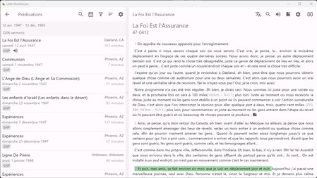 Little Storehouse est une collection de sermons de William Marrion Branham en plusieurs langues. L'application propose un filtrage riche des sermons par date et de nombreux autres paramètres. Une recherche en texte intégral de tous les sermons est également disponible. Outre le texte des sermons, des enregistrements audio des sermons sont disponibles.