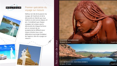 Spécialiste des voyages sur mesure, Meltour vous accompagne pour trouver et organiser votre prochain voyage. Avec cette application, parcourez nos thématiques pour organiser des vacances de rêve qui vous ressemble. Découvrez aussi nos exemples de parcours, à personnaliser selon votre budget et vos envie, qui vont vous inviter à voyager !