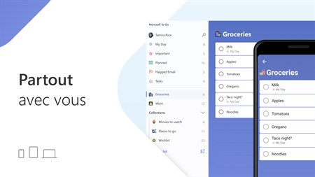 Voici ce que vous pouvez faire avec Microsoft To Do : • Conserver une vue d’ensemble de votre journée grâce à My Day, un planificateur quotidien personnalisé avec des suggestions de tâches • Accéder à vos listes où que vous soyez, sur n’importe quel appareil • Partager des listes et des tâches avec vos amis, membres de la famille, collègues et camarades de classe • Créer des listes avec des codes de couleur • Définir des échéances et des rappels ponctuels ou récurrents • Diviser vos tâches en étapes gérables • Ajouter des notes à une tâche • Joindre des fichiers d’une taille maximale de 25 Mo à n’importe quelle tâche • Synchroniser vos tâches entre Outlook et To Do Pour vos activités professionnelles, scolaires ou personnelles, To Do vous aide à vous organiser et à simplifier vos plans. To Do est gratuit et disponible sur tous vos appareils.