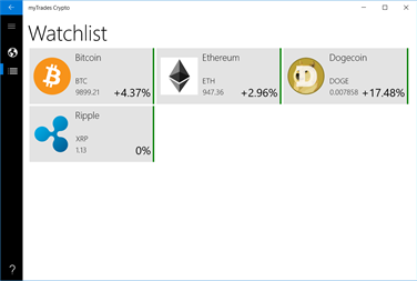 myTrades Crypto enables you to have an overview about the Cryptocurrency market. It contains multiple cryptocurrencies, like Bitcoin (BTC), Ethereum (ETH), LiteCoin, and many more. It also contains many cryptocurrency exchanges like Kraken, Bitfinex, Bitstamp, Gemini, Coinbase, BTCChina, BTER, and many more.