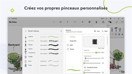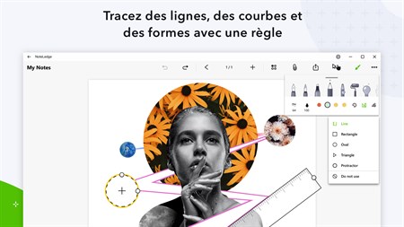 ÉCRIVEZ ET DESSINEZ, À VOTRE FAÇON + Un ensemble de pinceaux pour écrire, dessiner, dessiner et colorier + Créez vos propres brosses avec des images et personnalisez les modèles prédéfinis* + Générez instantanément des palettes de couleurs à partir de photos* + Tracez des lignes, des courbes et des formes avec une règle* + Zoom avant et zoom arrière dans la zone d'édition avec pincement à deux doigts