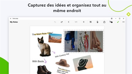 CAPTUREZ RAPIDEMENT LES IDÉES + Notez les idées avec des outils d'écriture et de dessin fluides + Tapez n'importe où avec différentes polices et couleurs + Prenez des notes et enregistrez de l'audio simultanément + Enregistrez de l'audio, ajoutez des photos ou insérez des vidéos + Ajoutez des légendes aux photos simplement en dessinant ou en tapant sur les images insérées + Organisez la mise en page avec des outils d'alignement et de calque intelligents + Faites glisser et déposez des images de pages Web ou de dossiers vers des notes