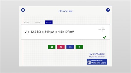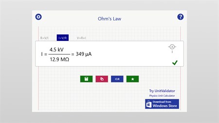 This app calculates Ohm's Law R=V/I, I=V/R or V=R*I. Enter the dependent value (V, I) for example with units (V, A, kV, mA, ...) and the result R will be calculated. The unit of R may be edited (Ω, kΩ, MΩ) and the numeric value will change accordingly.