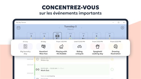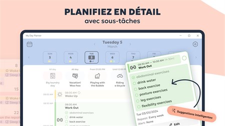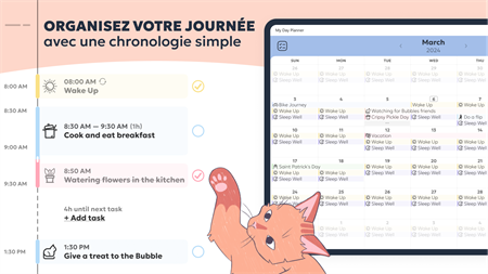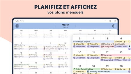 VISUALISEZ VOTRE ROUTINE QUOTIDIENNE - Obtenez une image détaillée de votre journée et suivez facilement vos progrès grâce à une chronologie verticale. - Visualisez vos tâches dans une vue de calendrier mensuel.