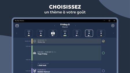 PERSONNALISEZ - Choisissez des icônes et des couleurs pour vos tâches et rendez-les reconnaissables en un coup d'œil. - Basculez entre un thème clair ou sombre, en fonction de vos préférences personnelles ou des conditions d'éclairage ambiantes.