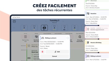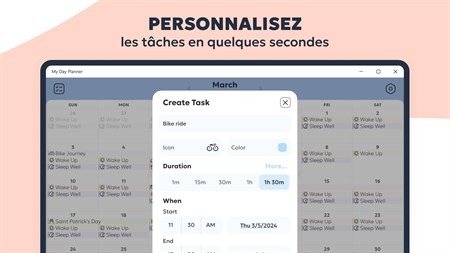 CRÉEZ ET MODIFIEZ FACILEMENT DES TÂCHES - Entrez le titre de la tâche, sélectionnez une icône et une couleur. - Réglez l’heure et la durée. - Créez des tâches récurrentes pour les activités qui doivent être effectuées fréquemment.
