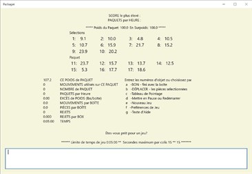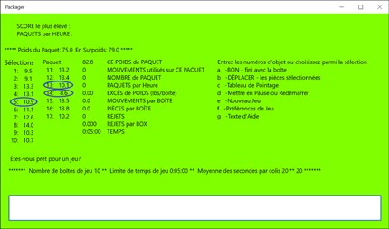 Numéros jeu. Entièrement textuel. Le jeu est conçu autour de l’industrie de l’emballage où les ouvriers ont une boîte sur une échelle et peuvent sélectionner des articles pour remplir la boîte, ajoutant et enlevant des articles. La boîte ne peut pas être inférieure à la spécification du poids du colis. Dans un effort contre le temps un joueur peut déplacer des nombres entre deux listes pour égaler la somme des poids dans la boîte avec la spécification de poids de paquet. Un commentaire d’un superviseur s’affiche lorsqu’un joueur indique que la case est terminée.