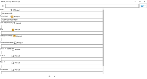 Mot de passe App est la dernière dans l'état du mot de passe de l'art et de la gestion de données confidentielles. Stocker en toute sécurité les mots de passe, cartes de crédit, numéros de téléphone, compte bancaire d'info et de nombreux autres types de données. Les données sont stockées en utilisant la dernière technologie de cryptage.