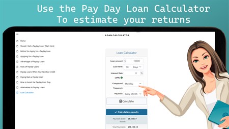 To get the best results you will: 1. Use our loan calculator to simulate your loan. 2. Get the full pay day advance loan guide with short easy to read lesson. 3. Use the lesson scheduling system to stay focused on getting all the knowledge you need. 4. Use the in-app course notebook. 5. Get more tools to achieve the best results.