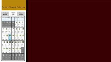Persian calendar or Iranian calendar is official calendar in Iran and Afghanistan. Sometimes called Shamsi or Hijri calendar. The application shows current Persian date (live tile) as well as a complete Persian calendar monthly view.