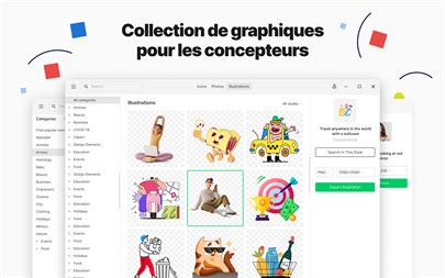 Fonctionnalités — Plus de 120 packs d'icônes stylisées, colorables et parfaites au pixel près, réalisés par les meilleurs concepteurs d'interfaces utilisateur en formats PNG, ICO, SVG, PDF, EPS, XAML et autres. — Des milliers d'illustrations créées par les meilleurs artistes de Dribble - plates ou 3D, vectorielles ou matricielles, à vous de choisir ! — Une immense collection d'images de personnes, d'animaux et d'objets prêtes à l'emploi et sans arrière-plan. Chaque image est catégorisée, classée par style et consultable par mots-clés !