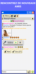+ Chat privé : En écrivant bien sûr, et partagez aussi des photos et des messages vocaux. + Appels vidéo : appelez n'importe qui de manière anonyme à l'aide de notre fonction de vidéoconférence gratuite. + Boîte de messagerie privée interne entre les utilisateurs. + Salons de discussion en direct publics, forums de discussion : par pays et par langue locale. + Listes d'amis : conservez votre propre liste d'amis pour la messagerie instantanée. + Rencontres ; organisation d'événements...