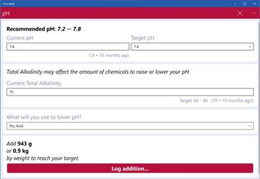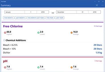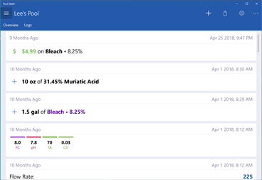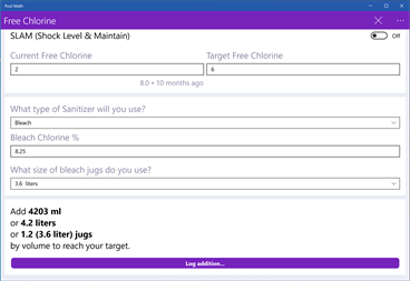 Pool Math's great features include: • Calculators for pH, Free Chlorine, Calcium Hardness, Salt, Total Alkalinity, Calcium Hardness, Borates, CSI • Track Maintenance: Backwashing, Vacuuming, Filter Cleaning, Filter Pressure, SWG Cell %, Flow Rate • Track Chemical Additions • Log Weather conditions • Bleach Price Calculator - Find the best deals on bleach easily • Summary page with test and chemical log insights and totals • Data backup / Export