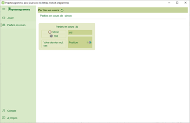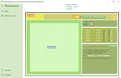 Popotanagrammo est un jeu de lettres en ligne style scrabble / popotamo. Le but du jeu est d'atteindre le plus rapidement possible un certain nombre de points en posant des mots valides sur un plateau de jeu. Le premier atteignant le nombre de point requis gagne la partie. Chaque joueur peut jouer à n'importe quel moment, tant qu'il dispose d'assez de lettre pour former un mot et qu'il forme des mots valides.