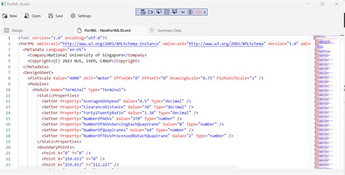 Container terminal design factors influenced container terminal throughput performance, including terminal components such as the boundary, dispatcher, wharf, yard area, transporter parking lots, and network. PortML organized these factors into an XML file for simulation. While PortML facilitated computer searches, manual editing was difficult, prompting the development of PortML Studio. This tool employed a "What You See Is What You Get" (WYSIWYG) approach, allowing users to drag and drop components to design the terminal and easily edit specific factors.