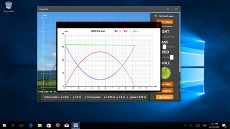 Cette animation permet d'étudier la trajectoire parabolique d'un projectile en pouvant modifier l'angle de tir, la masse du projectile, la vitesse initiale ou encore la hauteur de lancer sur Terre et sur la Lune. On peut afficher ou non une grille avec les axes, obtenir la valeur de y max et de x final ou encore afficher ou non la trajectoire du projectile en tenant compte des frottements.