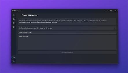 3. Page de contact et de support : PWA Composer comprend également une page de contact intégrée, offrant aux utilisateurs la possibilité de signaler des problèmes liés à l'application ou de soumettre des suggestions pour de nouvelles fonctionnalités. Cette fonctionnalité favorise l'interaction avec les utilisateurs, aidant ainsi les développeurs à résoudre rapidement les problèmes et à améliorer leur PWA en fonction des commentaires de la communauté.