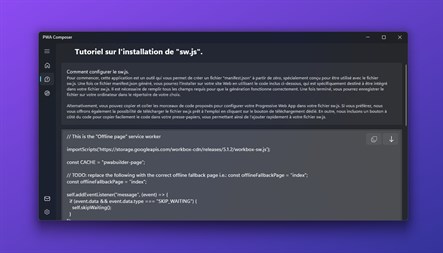 2. Code sw.js pour l'exécution du fichier manifest.json : Une autre caractéristique clé de PWA Composer est la génération automatique du code JavaScript pour le service worker (sw.js). Le service worker est responsable de la mise en cache des ressources de l'application, ce qui améliore considérablement les performances et l'expérience utilisateur. PWA Composer prend en charge la création de ce code de manière transparente, permettant aux développeurs de se concentrer sur le contenu de leur application plutôt que sur la gestion des caches.