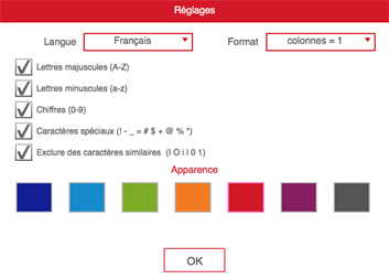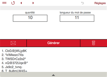 GÉNÉRATEUR DE MOT DE PASSE Générateur de mot de passe vous permet de générer des mots de passe d'une longueur donnée et la complexité. Pour générer des mots de passe sélectionnez la longueur de passe (jusqu'à 100), le nombre de mots de passe (jusqu'à 200), choisir les caractères que le mot de passe peut contenir, puis appuyez sur Générer. Vous pouvez mettre: - lettres minuscules - lettres majuscules - chiffres - caractères spéciaux - éventuellement exclure des caractères similaires. Générateur de mot de passe vous donne également la possibilité d'envoyer le mot de passe par e-mail.