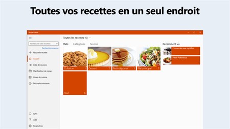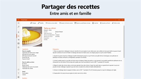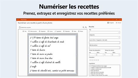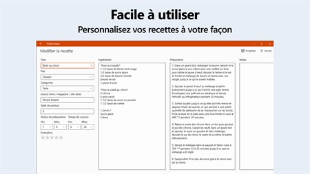 AJOUTER DES RECETTES RAPIDEMENT ET FACILEMENT Entrez vos recettes avec autant ou aussi peu d'informations que vous le souhaitez. Copiez et collez des recettes à partir de vos documents ou applications existants. Catégorisez vos recettes par type de repas et par catégorie. Ajoutez des photos, évaluez vos recettes et marquez vos favoris.