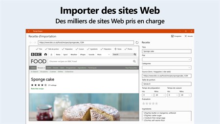 IMPORTATION DE RECETTES À PARTIR DE SITES WEB Recherchez des recettes sur le Web et ajoutez-les directement à votre collection. Des centaines de sites Web de recettes populaires pris en charge. Personnalisez les recettes importées en fonction de vos besoins.