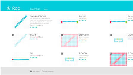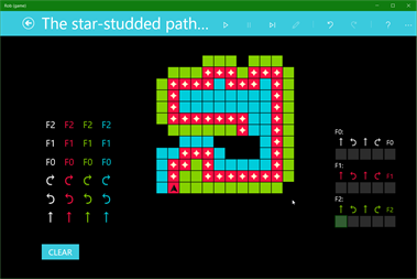 Rob is a programming puzzle game. Your program will control a robot to collect all items from 2D tri-colored field. You can move, turn, repaint cells and call very short (in most cases) functions.