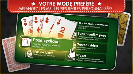 LE RAMI, TEL QUE VOUS LE CONNAISSEZ - Utilisez les cartes du rami original ou à la lisibilité optimale. - Choisissez votre jeu de cartes : français, tournoi, allemand… - Découvrez des règles spéciales : Frappe, 40 points pour la première pose et bien d'autres. - Jouez selon vos préférences, avec vos propres règles.
