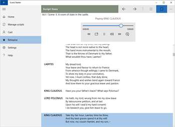 Then you can start learning! Scene Steeler will highlight your lines in the script, or hide them when you are ready to remember them. It can also use Windows' Text to Speech or your own recorded voice to read the script to you so you can practice saying your lines.