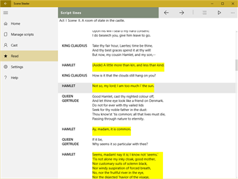 You will need the text of the script for the play you are in. Scene Steeler will import the text, identifying Acts, Scenes and the character parts. You tell it which character or characters are the ones you are playing.