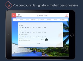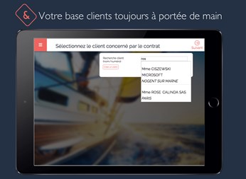 Sur le terrain : Sell&Sign accompagne le commercial dans tout son processus de vente - Le commercial accède à sa base client sur la tablette - Il présente les produits, à l'aide des visuels de l'entreprise, intégrés dans la tablette - Il aide ses clients à choisir les options, grâce à des écrans illustrés et interactifs - Il joint des photos au contrat : justificatifs ou photos métier - Il fait signer le contrat à son client directement sur la tablette !