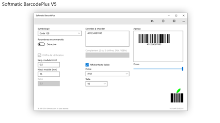 Softmatic BarcodePlus supporte également les codes EAN tronqués en hauteur, la réduction de largeur de barres et les marqueurs de cadre de limitation. Des sécurités incorporées vous empêchent de créer des codes-barres non-valides. Par commodité, tous les réglages sont conservés entre deux sessions.