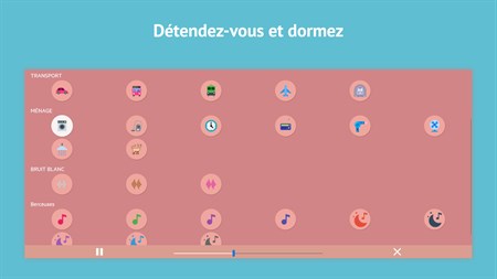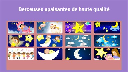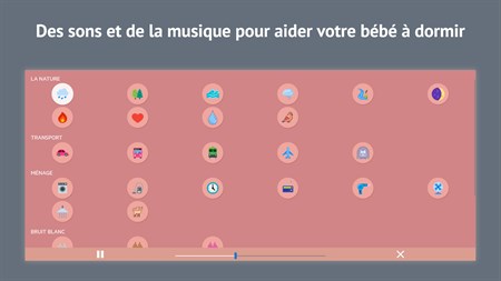 L'application contient une grande sélection de bruits blancs apaisants et de berceuses. L'application ne nécessite pas de connexion Internet, vous pouvez donc l'utiliser où que vous soyez.