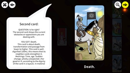 This game contains 4 different spreads depending on your situation: Celtic cross spread, three cards spread, romance / love spread and career spread. It can give you a detailed explanation for advanced users or a simple one for beginners. The game is translated in 8 languages and all results can be sent in your email. It contains 5 full decks of cards. The main one is our own custom made, animated deck and 4 historic Marseilles decks: Grimaud 1930, Conver 1760, Dodal 1715 and Noblet 1650. You can have your own reading which can be saved in 10 slots or a multiplayer in your living room to compare your results with your friends.