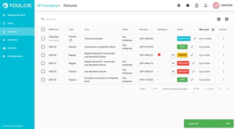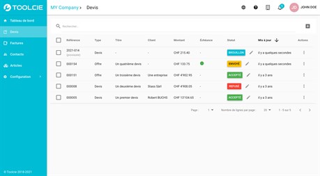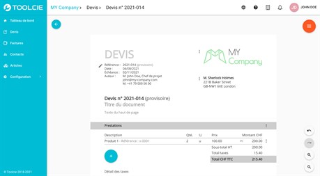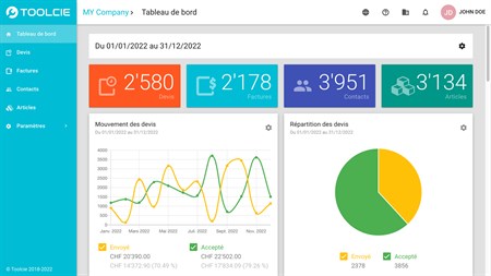 Toolcie est un logiciel de devis et facturation simple et intuitif pour les auto-entrepreneurs et PME. Les clients acceptent vos devis de manière plus rapide grâce à la possibilité de valider les offres en ligne. Faites-vous payer plus rapidement en acceptant les paiements en ligne par cartes bancaires, par virements bancaires ou encore en paiements échelonnés. 14 modèles de mise en page prédéfinis permettent la création de documents professionnels à l’image de votre entreprise. Toolcie permet également de gérer vos clients et les articles de votre entreprise. Le tableau de bord permet d'avoir une vue d'ensemble de l'activité comme l'affichage du chiffre d'affaires, les meilleurs clients, les articles les plus vendus.