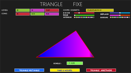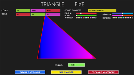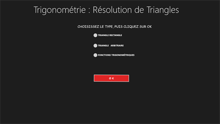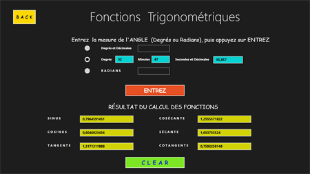 "Trigonométrie Résolution Triangles» est utilisé pour calculer la mesure des trois côtés et l'amplitude des trois angles d'un triangle quelconque, offrant entrée: a) seuls deux éléments, dont l'un au moins d'un côté (x triangle); b) seulement trois éléments, dont au moins un côté (x tout triangle). Une fois que vous avez fait les calculs, affiche l'image du triangle calculé sur une échelle mobile, ce qui lui permet de toujours afficher. Sur cette page, vous pouvez agir sur les couleurs variant triangle, en zoomant, déplacement et la rotation. Il est toujours conseillé lorsque les données d'entrée est incorrect, quand ils ne donnent pas lieu à un triangle et quand ils donnent naissance à deux triangles différents. Dans ce dernier cas, il est possible d'afficher, un à la fois, les deux figures. Cette application est très utile pour les élèves des lycées scientifiques et des étudiants universitaires (en particulier les facultés de génie et mathématiques). L'éditeur et l'auteur n'assument aucune responsabilité pour les erreurs dans les calculs économiques et donc suggèrent que vous faites toujours la réanalyse par d'autres moyens avant de définir les projets qui ont coûté, ou au moins des effets économiques. VERSION 2.0: Ajout d'une fonction de calcul trigonométrique. VERSION 3.0: l'application localisée avec l'ajout de versions en ANGLAIS et en FRANÇAIS.