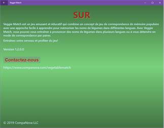 Caractéristiques principales: - Plusieurs niveaux et options à choisir - Supporte 3 niveaux de difficulté (facile, moyen, difficile) - Plusieurs langues (7 langues) à choisir (anglais, espagnol, français, allemand, italien, portugais et russe - avec plus à venir) - Apprenez rapidement et mémorisez comment dire tomate, concombre, oignon blanc, oignon, ail, carotte, laitue, pomme de terre, chou pommé, chou blanc, radis, aubergine, champignon, courgette, poivron, artichaut, maïs, betterave, brocoli, avocat, épinard, chou-fleur, piment, haricots verts, l'asperge, citrouille, céleri en anglais, espagnol, français, allemand, italien, portugais et russe - Les technologies Text-To-Speech offrent un moyen simple et efficace d'apprendre des mots et des sons étrangers. - Conserve les meilleurs scores locaux pour tous les niveaux, modes et langues - Un jeu unique pour apprendre rapidement les langues étrangères - Convient pour les enfants, les enfants d'âge préscolaire et les adultes - Idéal pour les programmes de maternelle et préscolaire - Aide les enfants à mémoriser des alphabets et des mots étrangers - Les enfants adorent ça! - Meilleur jeu de mémoire avec des sons et de la prononciation - Apprendre l'anglais, l'espagnol, le français, l'allemand, l'italien, le portugais et le russe - C'est un jeu gratuit. - Un des meilleurs jeux gratuit de mémoire correspondant
