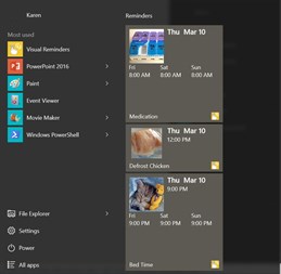 With Visual Reminders you can create a picture reminder to: - take a pill 3 times a day, every day of the week - to do a household chore 3 days a week at different times each day Each reminder can be pinned to the start screen to give you a quick view of upcoming notification times. The times on the start screen tile automatically update when reminders expire.
