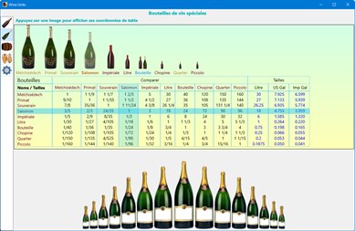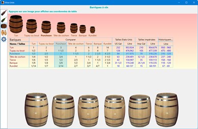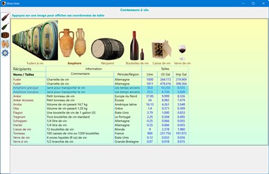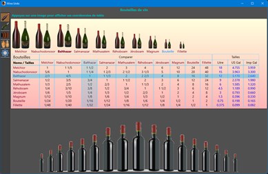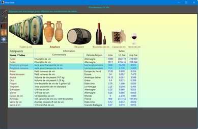 Au fil des siècles, les hommes ont conservé le vin dans différents contenants : amphores, tonneaux, bouteilles, caisses, etc. Ils leur ont aussi donné des noms et utilisé différentes tailles. Cette application affiche quatre groupes de contenants de vin et leurs noms : tailles de bouteilles régulières, tailles inhabituelles de bouteilles, tailles de barils et différents autres contenants. Au sein de chaque groupe, l'application compare les bouteilles, barils ou contenants entre eux et donne leur volume en litre, US gal et Imp gal.