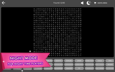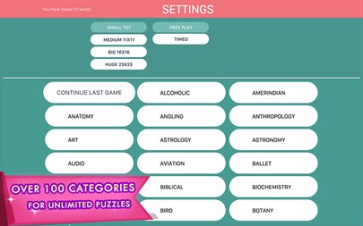 - Unlimited puzzles - Lots of different categories to keep you searching for words for a long time! - Timed mode for those who like challenges. - Free Play for those who like to enjoy word searching without time limits. - Multiple sizes of grids to adjust word search challenge level. - Hints to avoid word searching frustrations. - Night mode for night time word searches.