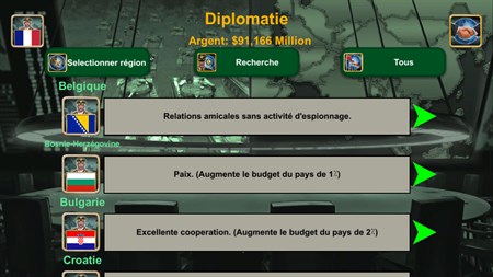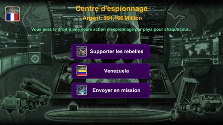 Il y a 180 pays disponibles dans le jeu, vous choisissez le pays que vous souhaitez diriger et commencez la partie. Le jeu contient: des fabriquants d'armes du monde entier, un centre d'espionnage, un cabinet de guerre, des options diplomatiques, l'Organisation des Nations Unies, un système économique, des recherches technologiques, des informations du monde (économie, relations, espionnage, et guerre) et une intelligence artificielle avancée. Armes du jeu: Mercenaires, Transports de Troupes Blindés (APC), Tanks, Artillerie, Missiles anti-aériens, Hélicoptères, Avions de combat, Bateaux, Sous-Marins, Robots de combat, Drones aériens (UAV), Portes-Avions et Missiles ballistiques.
