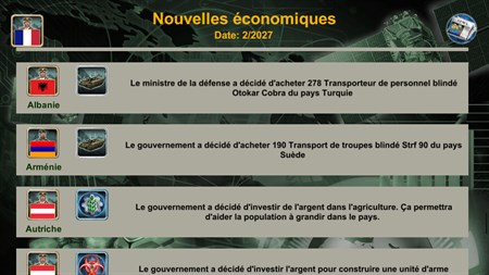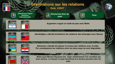 En tant que nouveau dirigeant, votre objectif final est de devenir le leader suprême du monde. En utilisant tous les moyens, de la diplomatie à la guerre, vous devez faire de votre mieux pour construire un empire supérieur aux autres, à la fois militairement et économiquement. Êtes-vous prêt à diriger, Commandant Suprême ? Le jeu est basé sur un joueur contre une intelligence artificielle très ingénieuse, établie selon les événements actuels et l'état des pays. Notre équipe récupère et met à jour quotidiennement le statut des pays à partir de données réelles: économie, relations, statut militaire, etc.