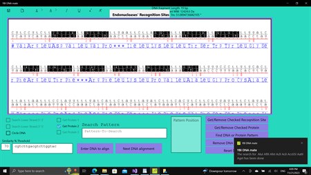 This software is designed for people doing DNA molecular diagnostics and DNA molecular cloning. Input DNA in FASTA format, convert single strand DNA to double stranded DNA, search for DNA patterns in 5'-3', 3'-5' and 3'-5' reverse directions, generate protein for 3 frames, check for location of some endonucleases' recognition sites, etc. In DNA editor, you select DNA fragment, right click and copy selection to see fragment's parameters and name of endonucleases' recognition sites in that fragment. Follow this link to check tutorial on using this software: https://youtu.be/I02-BfEs7WY