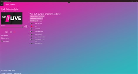 Einfache, schlanke App um 1LIVE noch besser zu hören, als über den WebBrowser. Nehme den Stream auf, verändere die Lautstärke um es leise nebenher laufen zu lasse, oder höre einfach auch die anderen Channels.